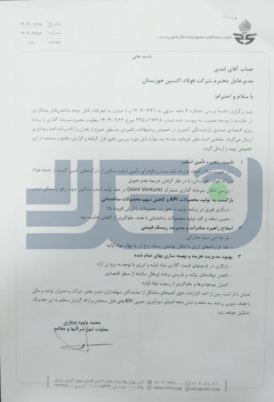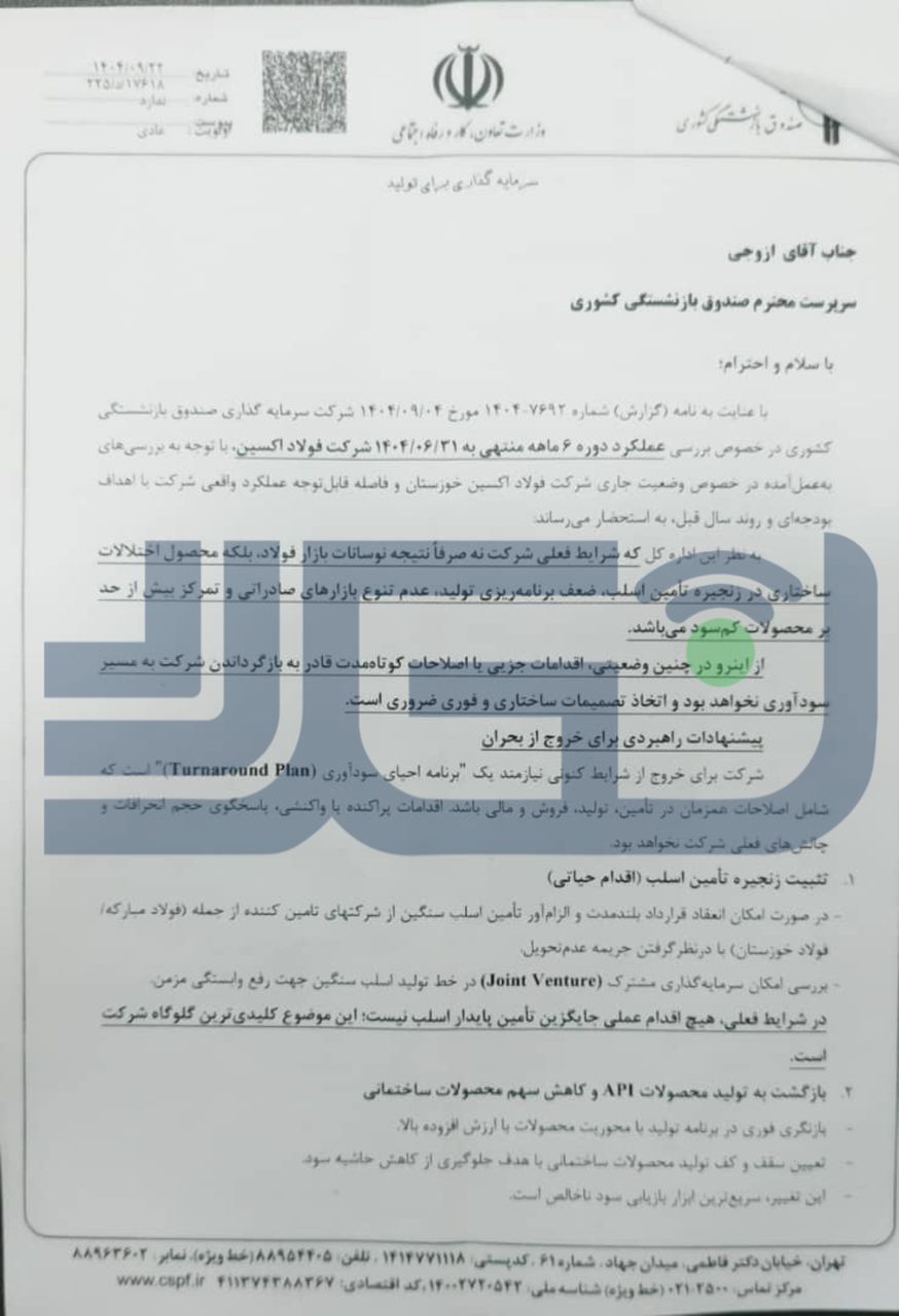 نگرش امروز – سرویس اقتصادی: در حالی که بوقهای تبلیغاتی شرکت فولاد اکسین خوزستان در ماههای اخیر تلاشی تمامعیار برای عالی نشان دادن اوضاع و رکوردهای صوری داشتند، اسناد واصله به نگرش امروز از یک زلزله مدیریتی و تایید رسمی بحران ساختاری در این غول صنعتی پرده برداشت. معاونت سرمایهگذاری صندوق بازنشستگی کشوری با صدور هشدار قرمز، عملاً بر تمامی تحلیلهای پیشین مبنی بر انحراف فاحش مدیریتی در این شرکت صحه گذاشت.